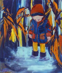 Das eingereichte Werk "Versunken" 2024 zeigt meinen Sohn (2 Jahre) in einer Pfütze stehend. Gedankenverloren blickt das Kind ins Wasser, die Welt scheint still zu stehen, obwohl die Umgebung laut und lebendig bleibt. Es wird deutlich, wie gut Kinder im Hier und Jetzt leben können – jeder Moment wird ehrlich erlebt. Gleichzeitig erinnert das Bild daran, dass Elternschaft auch anstrengend sein kann - solchen Momenten Raum zu geben, in einem oftmals stressigem Alltag, ist nicht immer leicht.